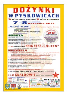 Serdecznie zapraszamy na XX pyskowickie Dożynki Miejskie oraz XV Dożynki Powiatu Gliwickiego, które odbędą się 7-8 września br. na placu przy zbiegu ulic Wojska Polskiego, Szpitalnej i Dworcowej w Pyskowicach. Podczas dwudniowej imprezy nie zabraknie atrakcji dla całych rodzin. Tradycyjnie już, w niedzielę po mszy dożynkowej, ulicami miasta przemaszeruje barwny, największy na Śląsku korowód dożynkowy. Na uczestników dożynek czekać będzie loteria z atrakcyjnymi nagrodami rzeczowymi. Przez dwa dni na dożynkowej scenie zaprezentują się grupy biesiadne, kabaretowe, gwiazdy disco czy zespoły coverowe. Gwiazdą jubileuszowych dożynek będzie popularny zespół „Skaldowie”.